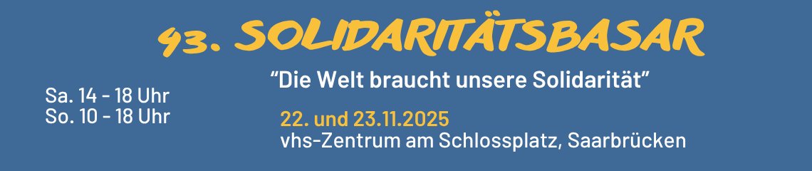 Am Samstag, den 22. und Sonntag, den 23. November findet, 45 Jahre nach der Gründung, der 43. Solidaritätsbasar im vhs-Zentrum am Saarbrücker Schloss unter dem Motto „Die Welt braucht unsere Solidarität“ statt.